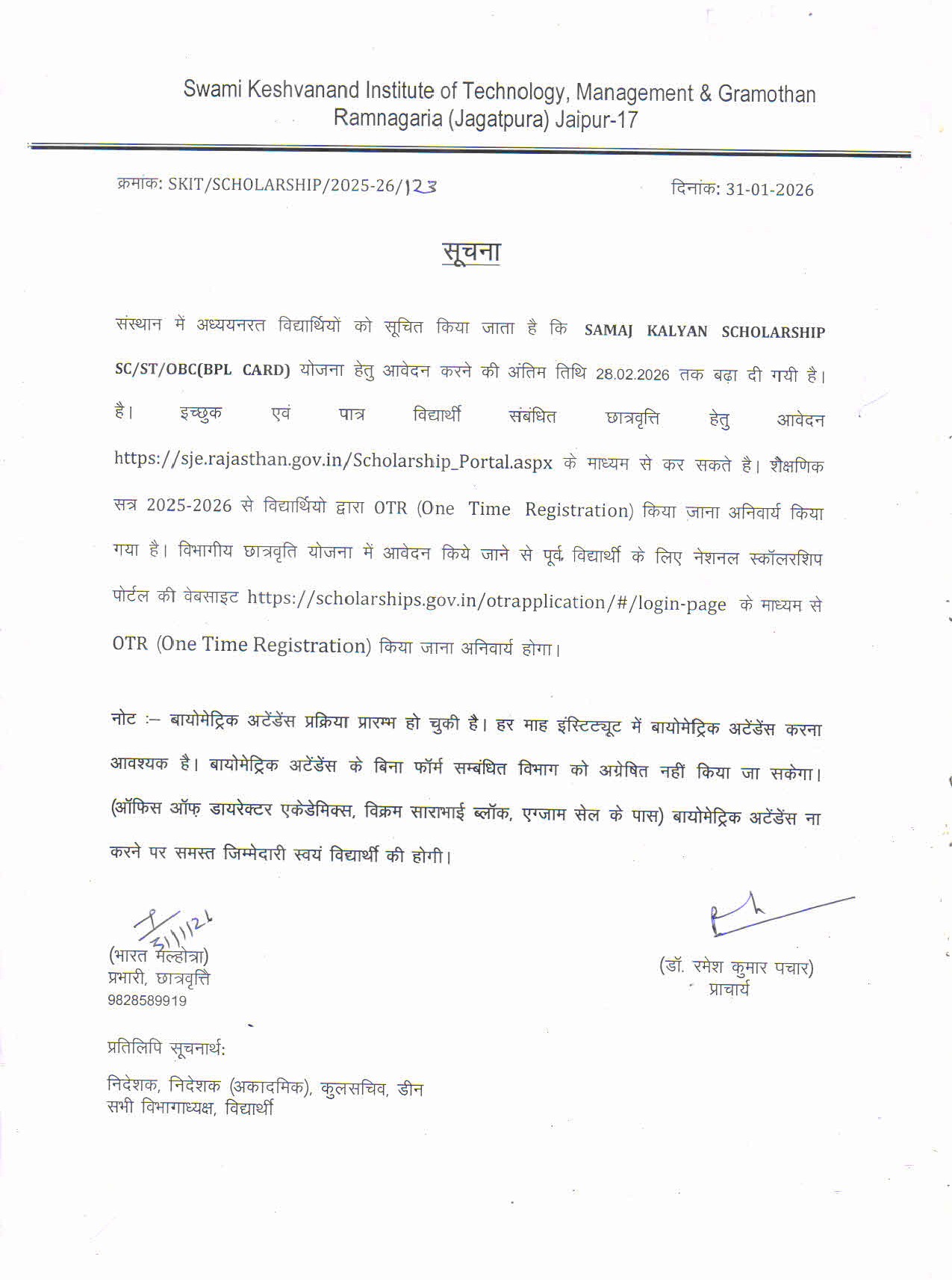 | 21.11.2025 | Notice regarding Samaj Kalyan Scholarship(SC/ST/OBC) Scholarship Portal open till 31.12.25 | View/ Download | |