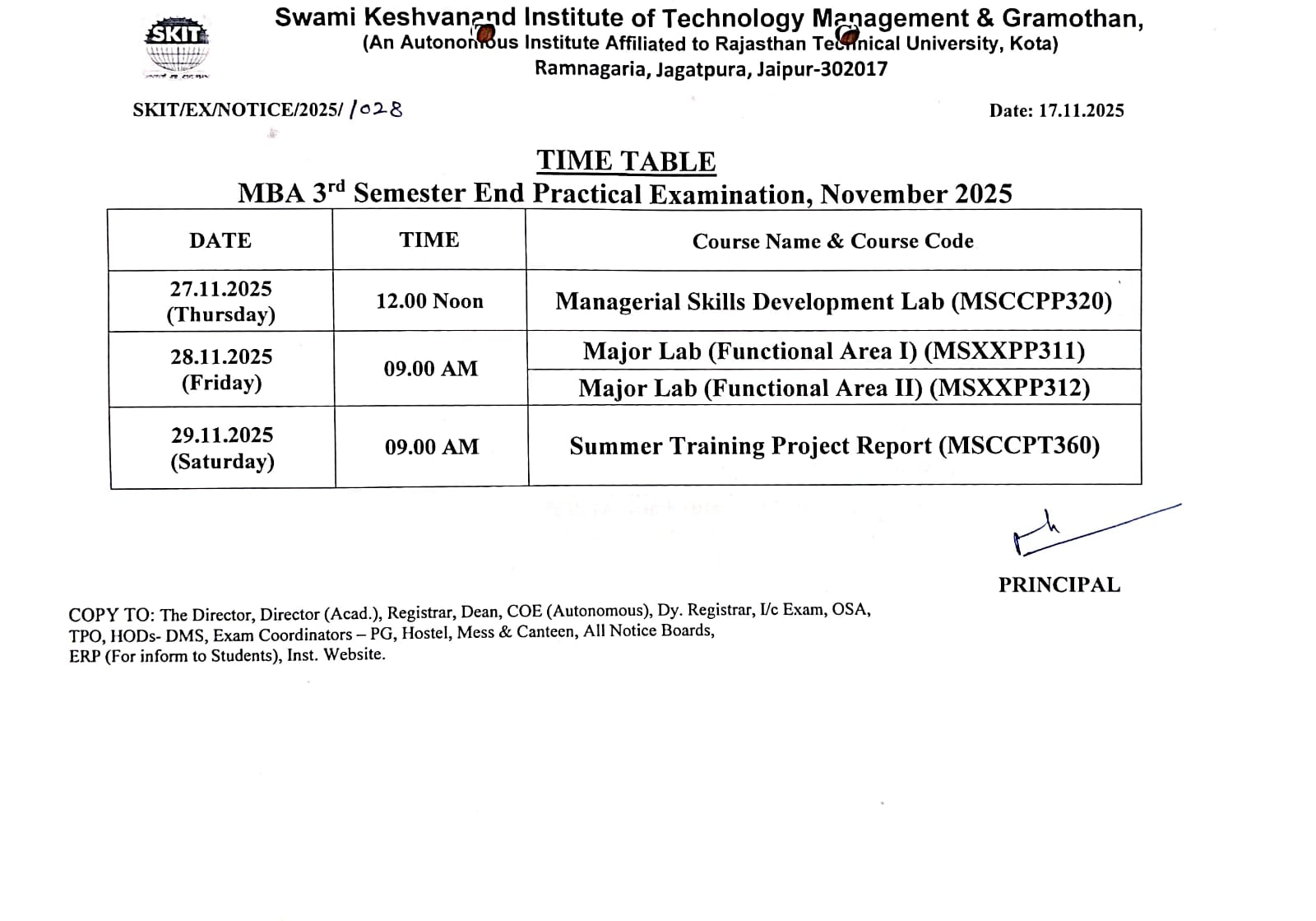 Time Table of Semester End Practical Examination of MBA 3rd Semester Nov. 2025