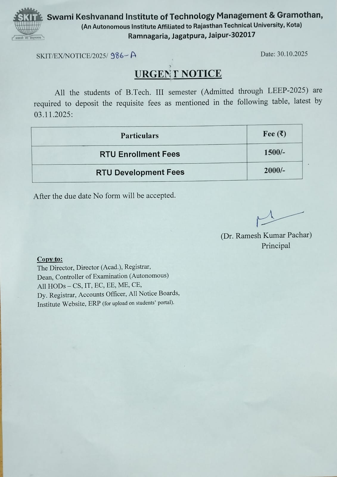 Notice regarding Enrollment forms & Fee for B.Tech 3rd Semester_Autonomous. (admitted through LEEP-2025)
