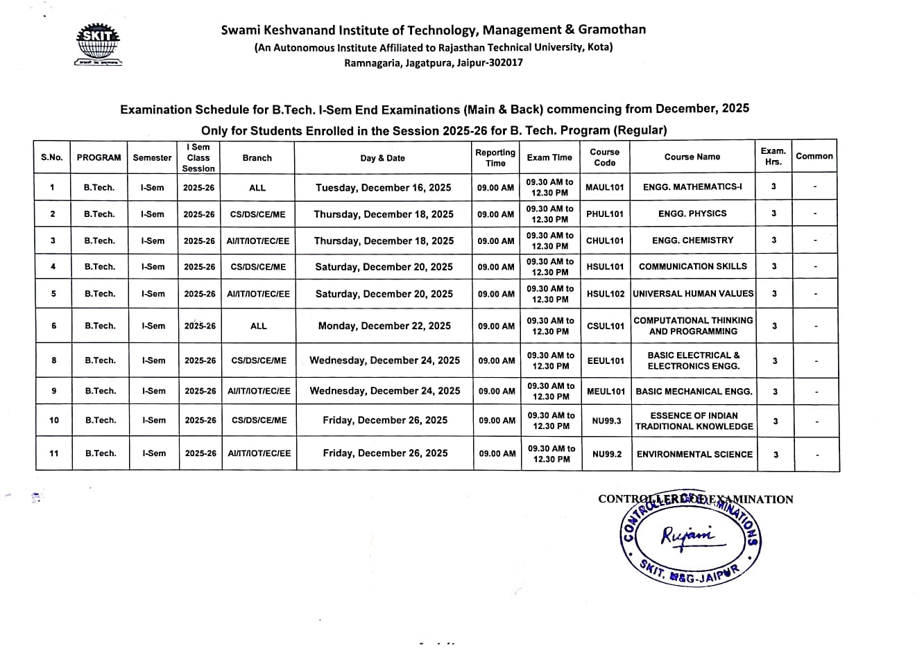 Time Table of Semester End Examination of B. Tech 1st Sem exam 2025
