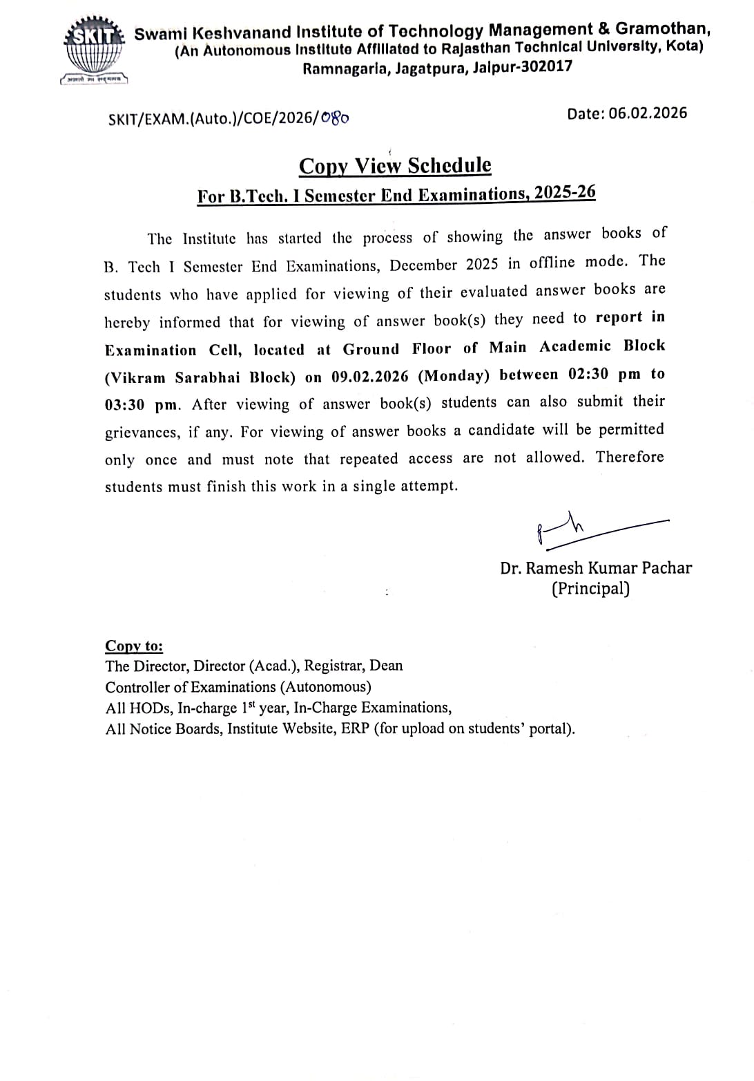 Notice regarding Copy View schedule of B.Tech I semester exam (Autonomous) December 2025.