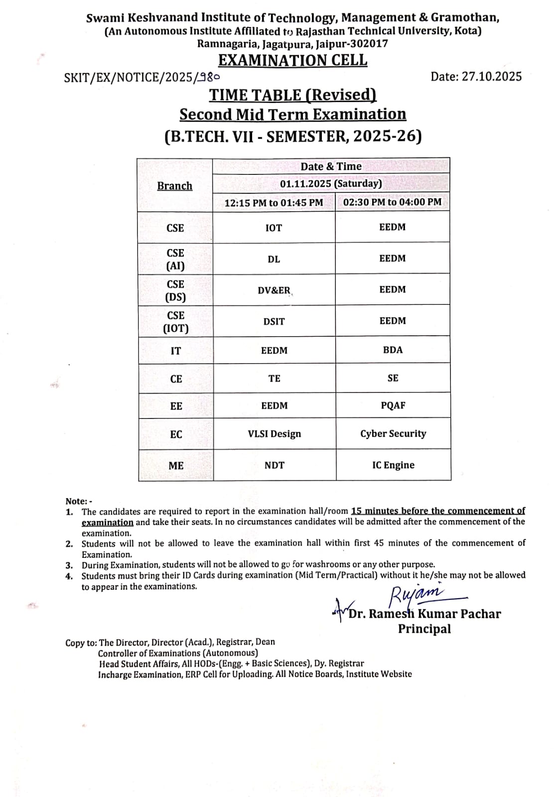 Revised Time Table of Second Mid Term examination for B.Tech 7th Semester Nov. 2025