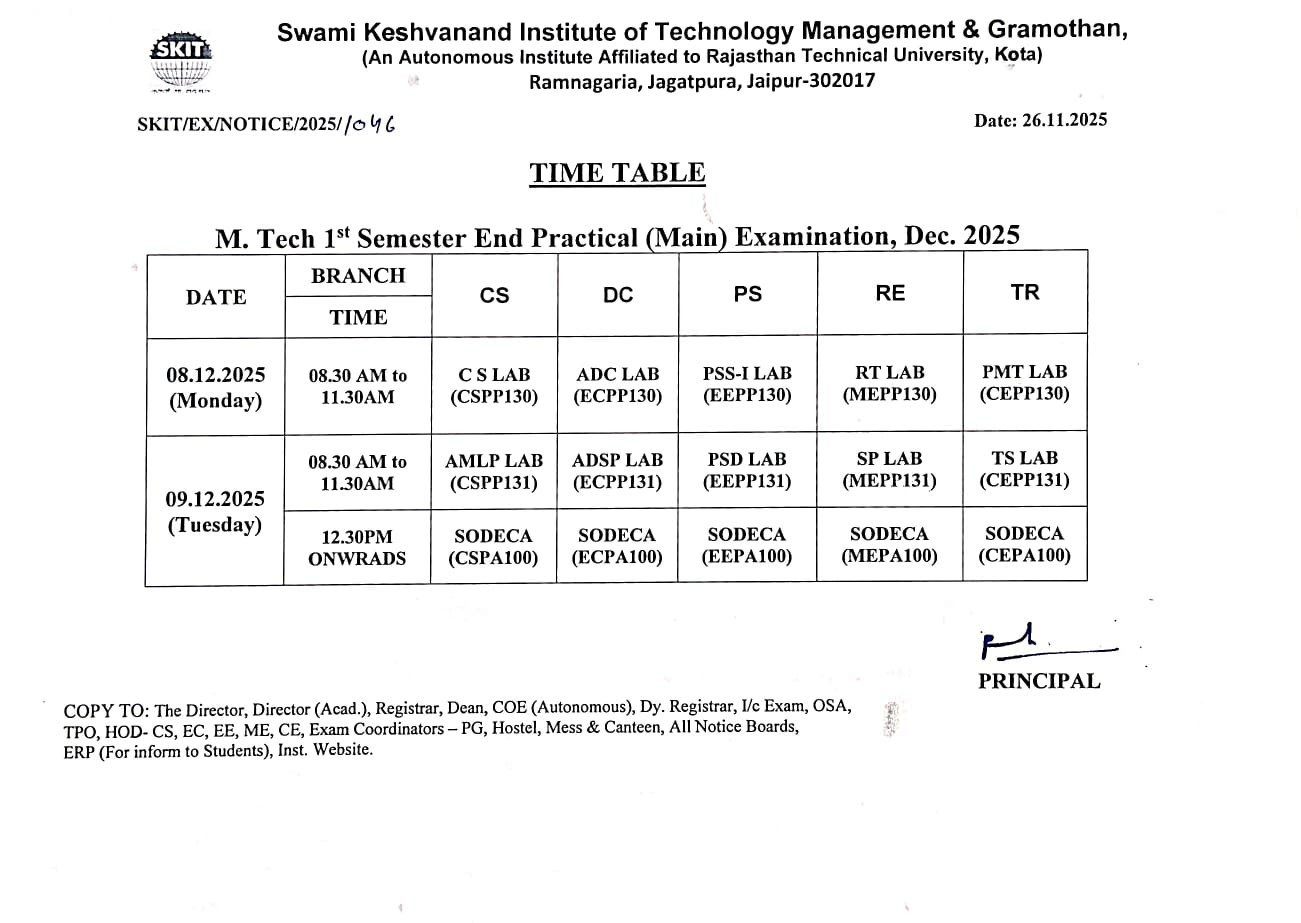 Time-Table of Semester End Practical Examination of M.Tech 1st Semester (Main) Exam 2025-26