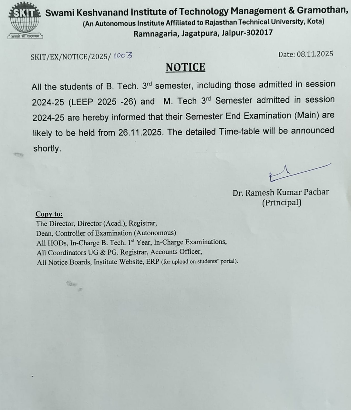 Notice regarding date of Semester End Examination of B.Tech 3rd Sem & M.Tech 3rd Sem. exam 2025