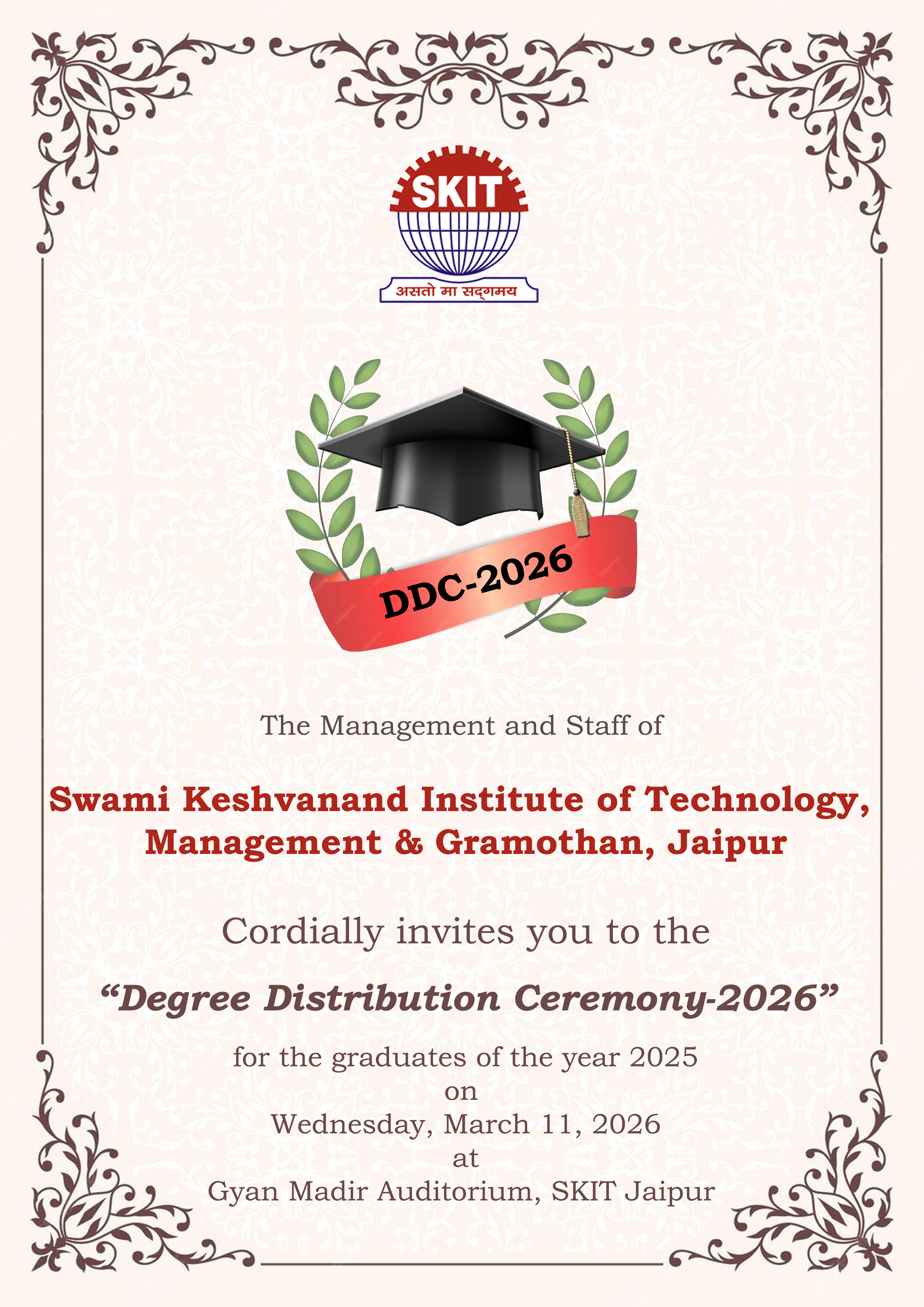 The institution is pleased to invite all students who graduated in the year 2025 to attend the Degree Distribution Ceremony on March 11, 2026. The guidelines for participation in the ceremony are as follows: